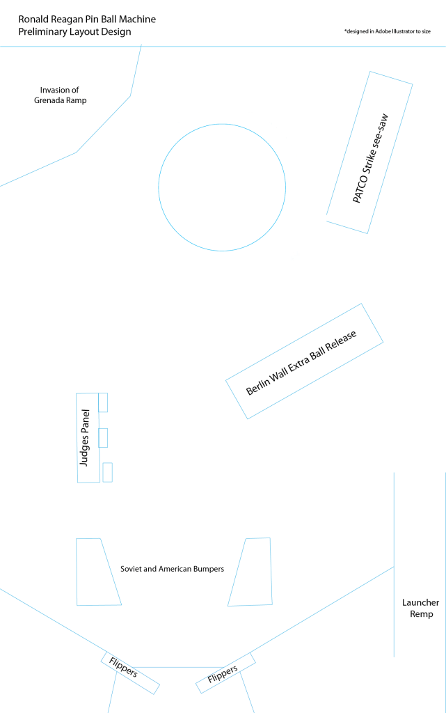 I also created artwork that aligned with their chosen theme, the Reagan Administration. By researching the era, we decided on key events during 1980’s that we wanted to visually feature on the machine. These events became the contraptions and decor on the machine. We have cold war bumpers, a judge appointment panel, a PATCO strike see-saw, an invasion of Grenada ramp, and Just Say No to Drugs propaganda.