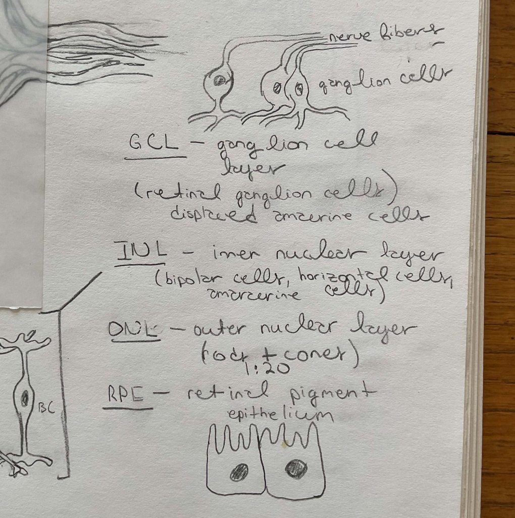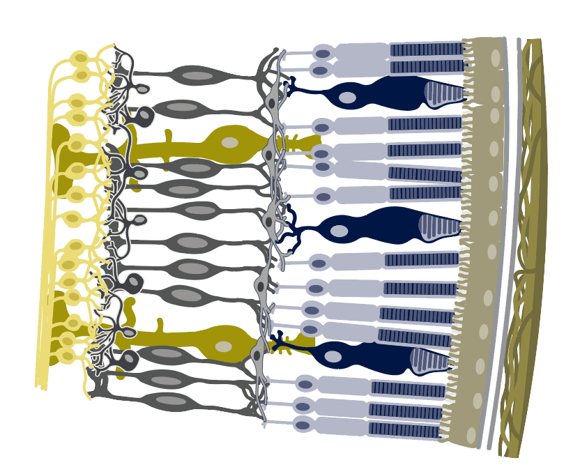 A preliminary sketch was done to refamiliarize myself with the anatomy of the eye and the structures the client had requested. Additionally, I researched function of each of the cell types to be shown in the retinal section along with the different layers. I referenced other illustrations, photographs, and histological images to develop the shapes for the individual cell types. Once the sketch was finalized, I traced it in Adobe Illustrator.