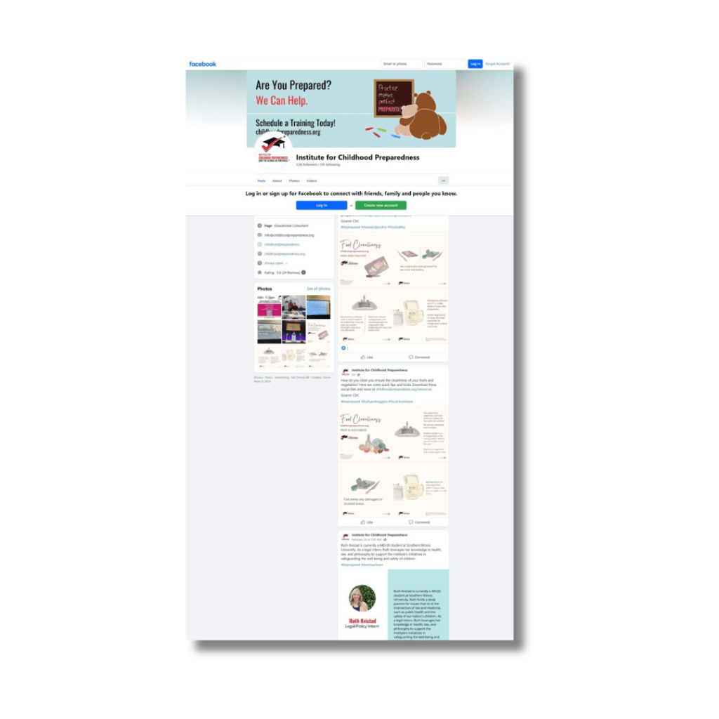 I have worked for the Institute for Childhood Preparedness (ICP) for over five years first as an intern and now as their head designer. During my time there I have developed over 50 info-graphics that be downloaded or printed from their resource page, managed their social media channels on Instagram, Facebook, LinkedIn, and Twitter, and maintain their website in Wix.