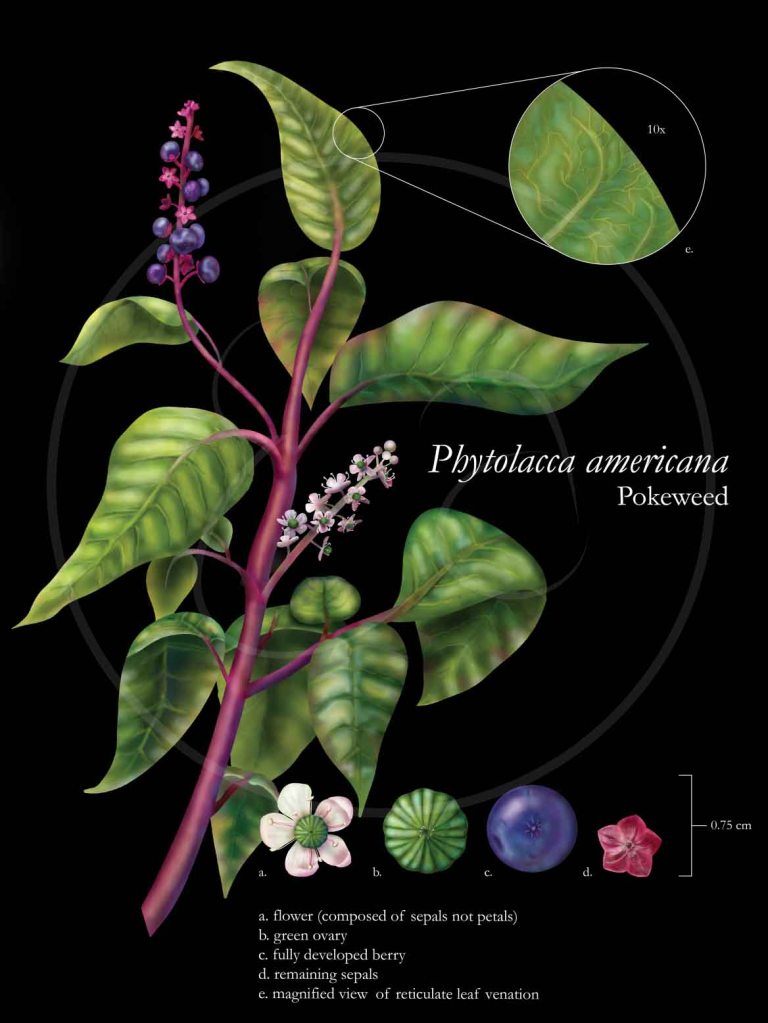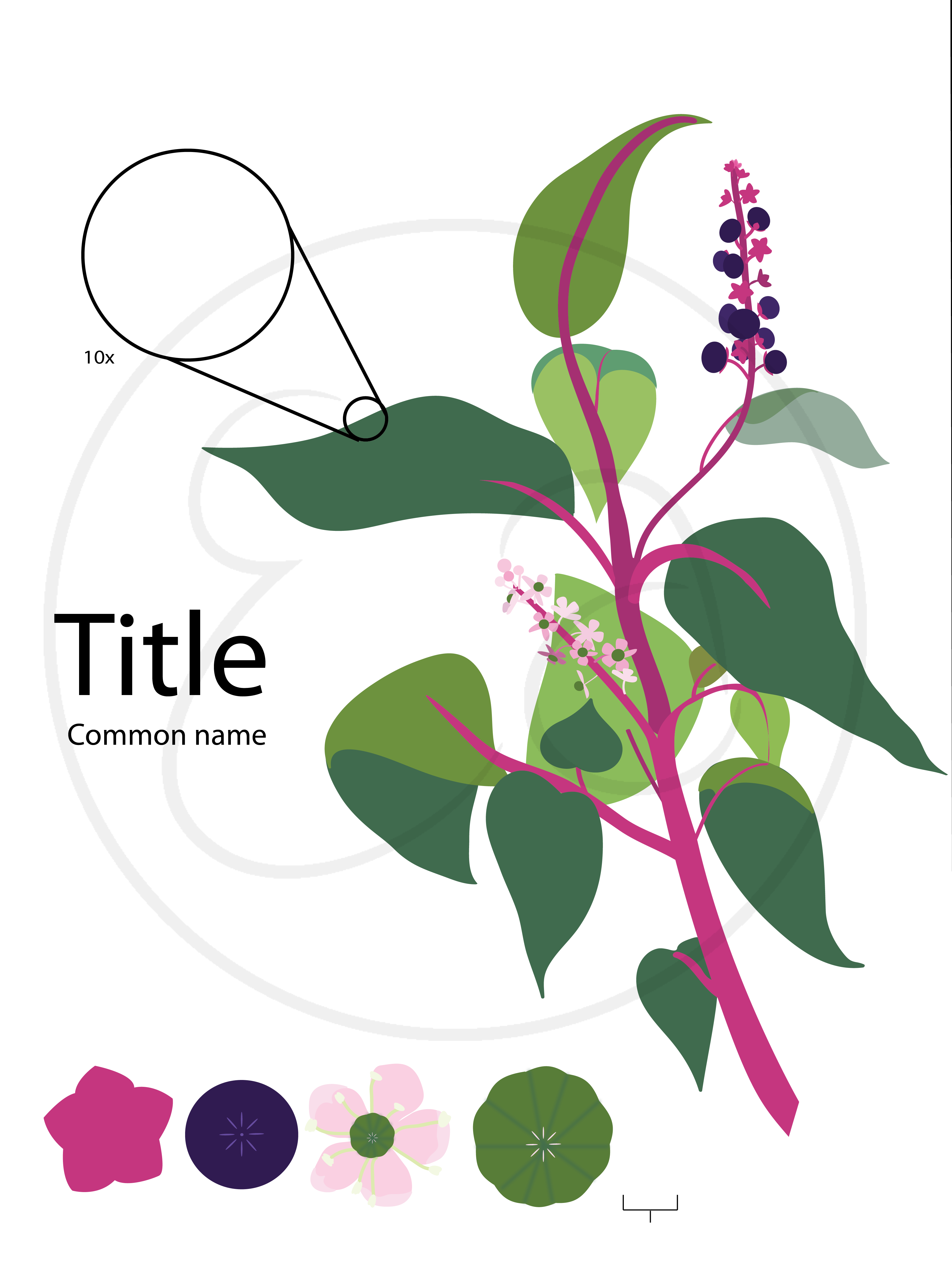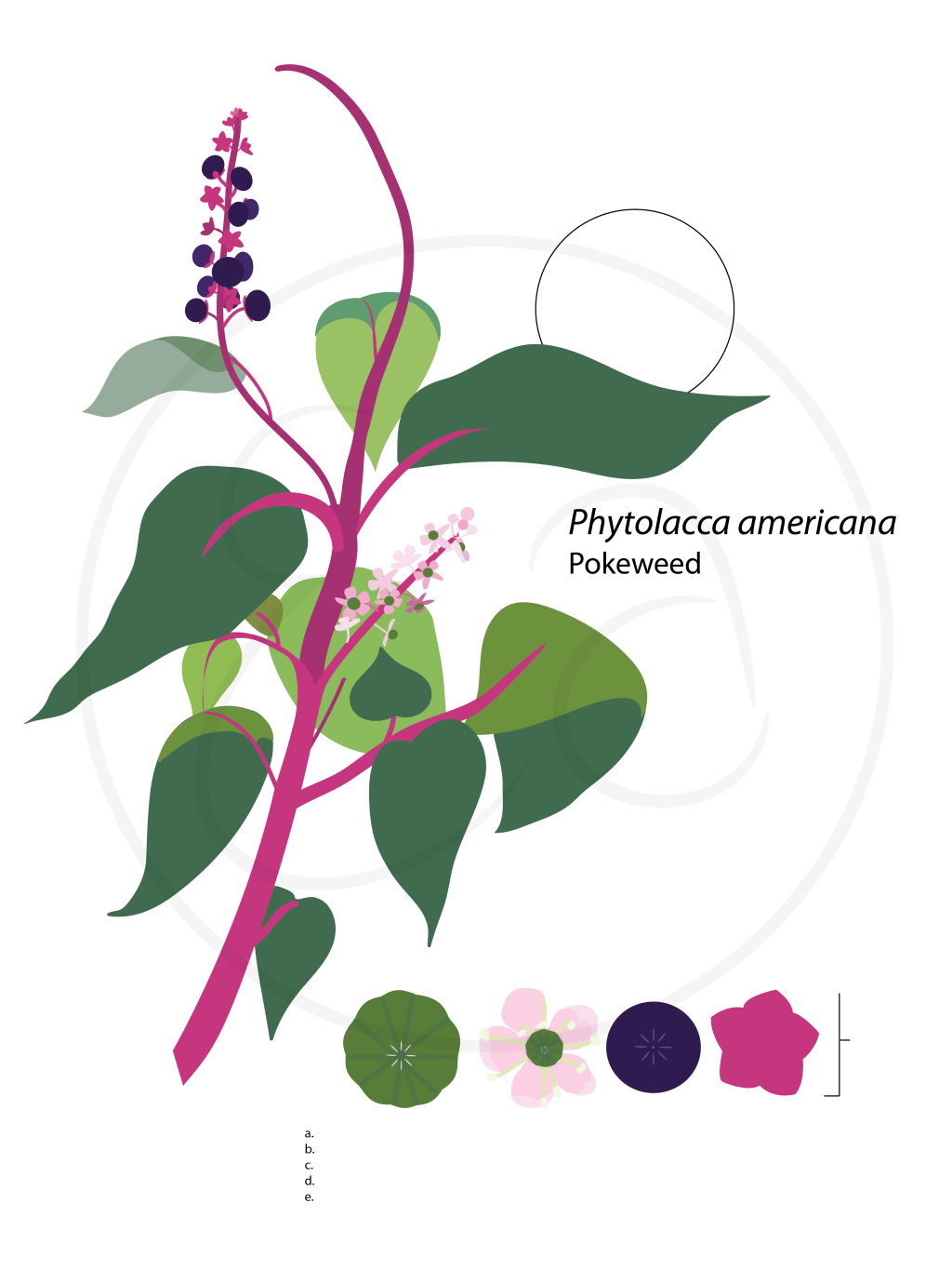 The purpose of this project was to create a digital or traditional botanical plate including five elements of a botanical specimen. The artist visited the Iowa State Green House to choose a botanical species to focus on and to sketch from direct observation. While there, the artist decided to depict the pokeweed plant because of its unique coloration and poisonous nature.