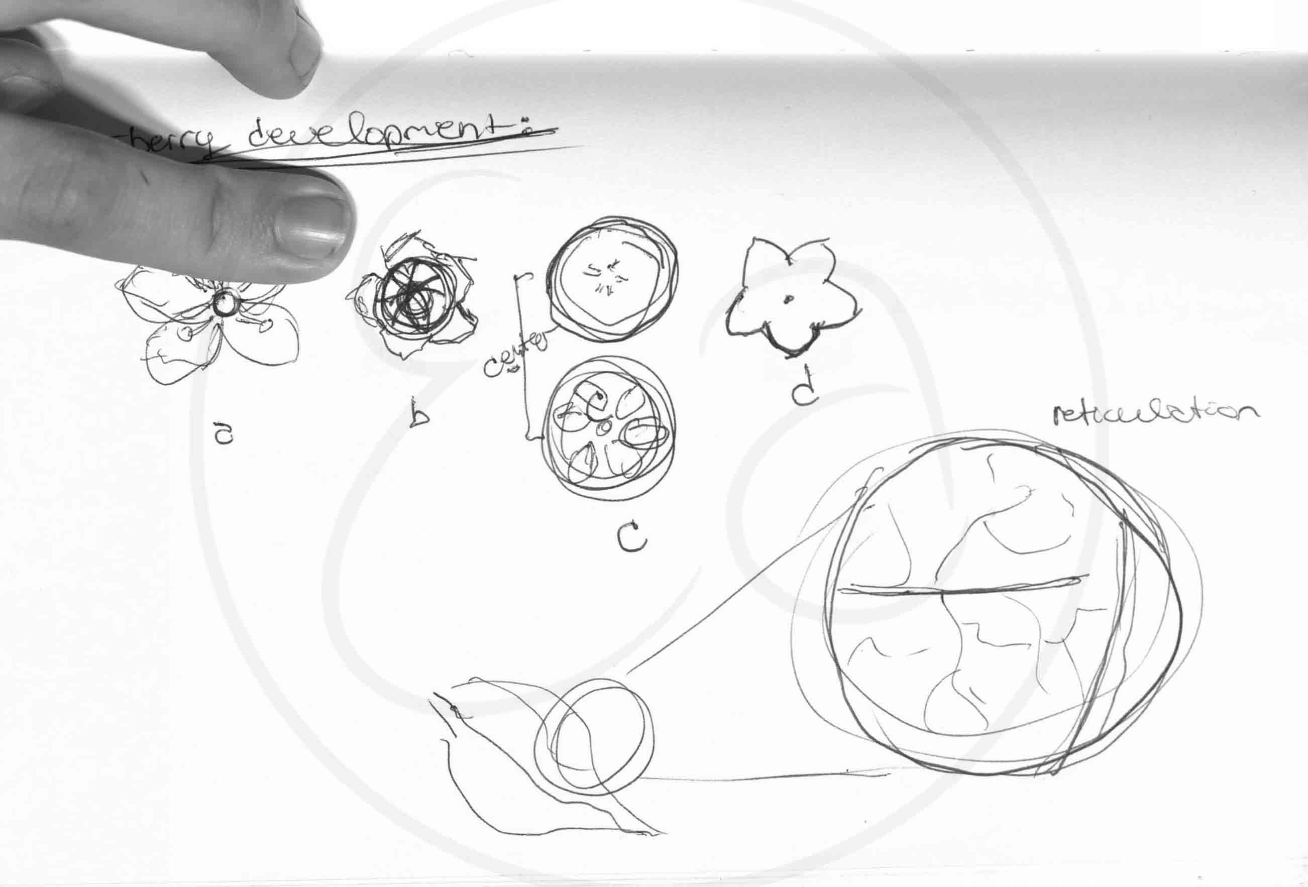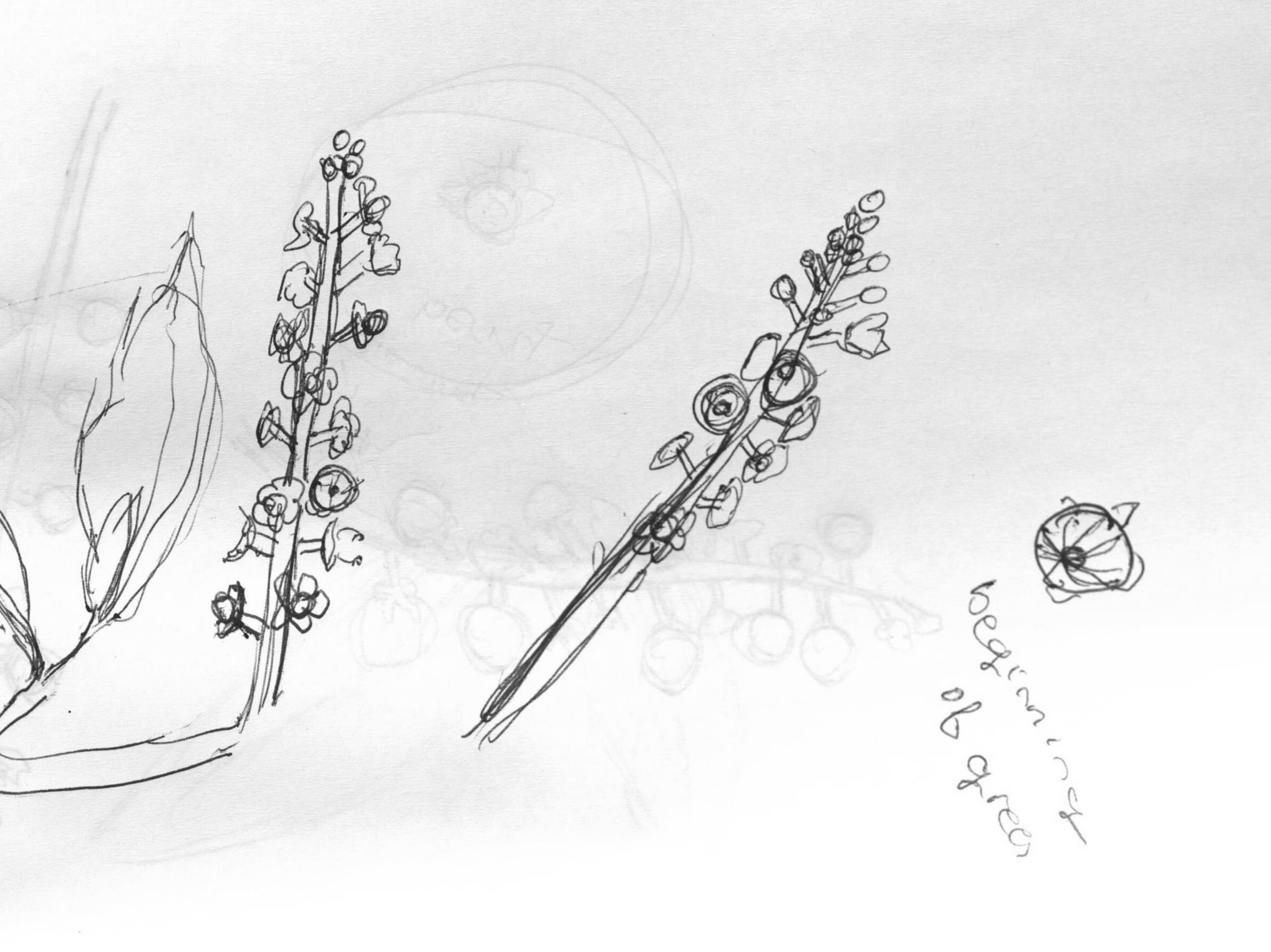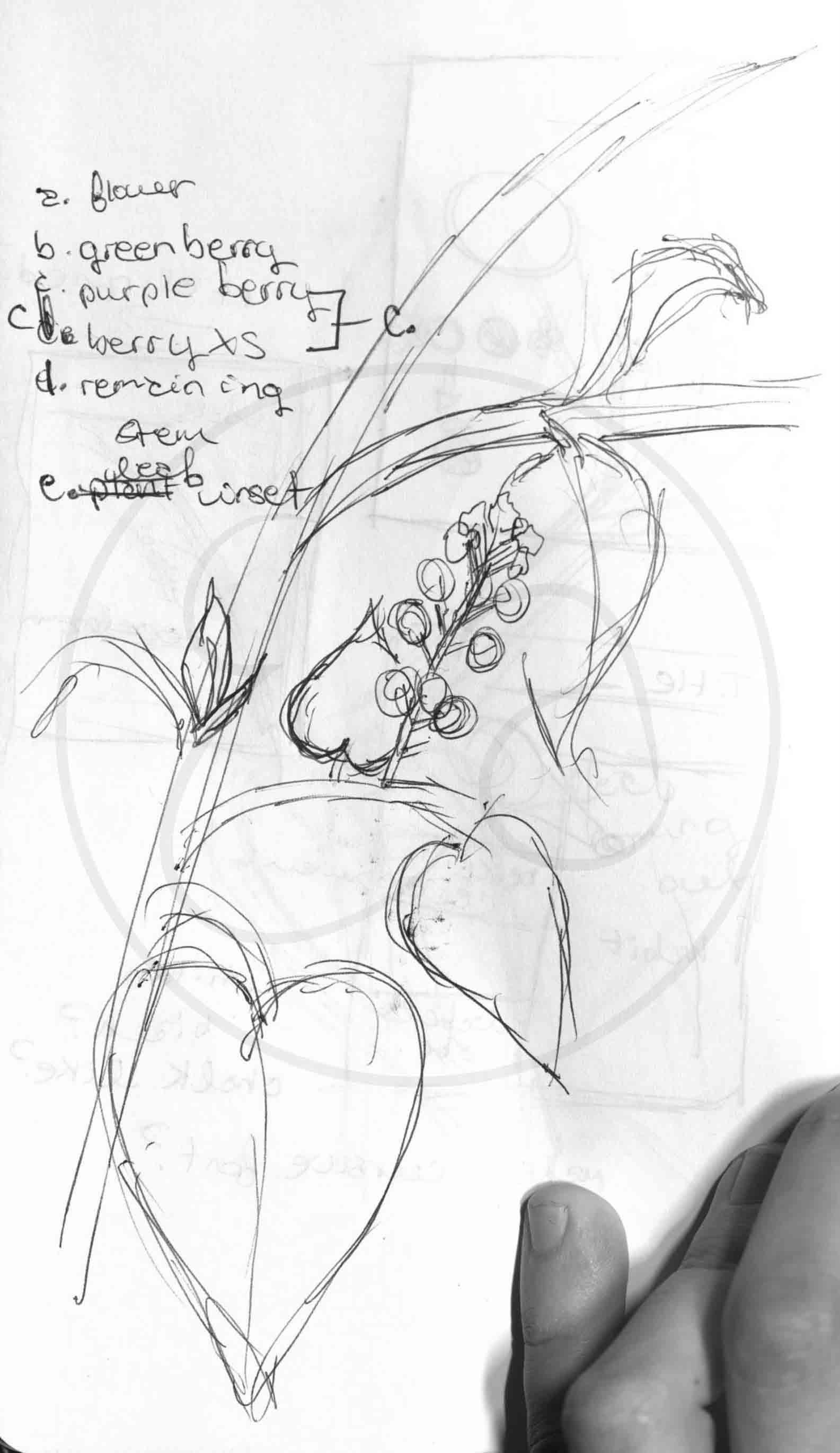 The purpose of this project was to create a digital or traditional botanical plate including five elements of a botanical specimen. The artist visited the Iowa State Green House to choose a botanical species to focus on and to sketch from direct observation. While there, the artist decided to depict the pokeweed plant because of its unique coloration and poisonous nature.