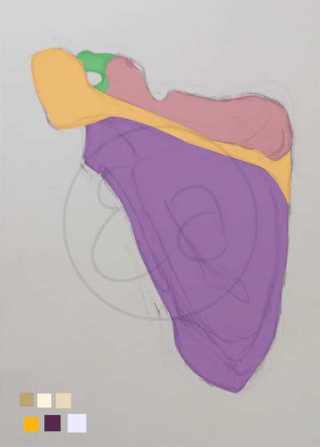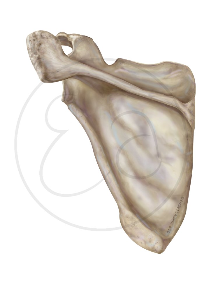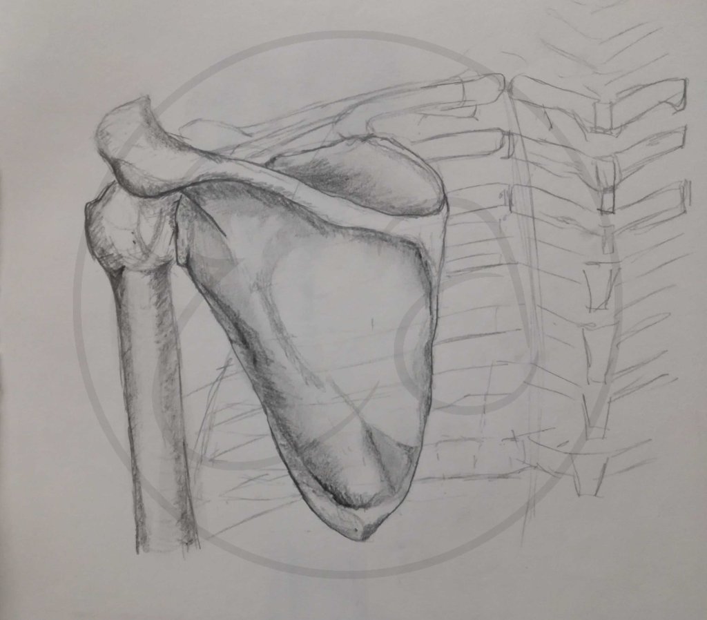 The purpose of this project was to realistically render a human scapula in Adobe Photoshop from direct observation. The initial drawing of the scapula was done by hand and then brought into Photoshop. The scapula was staged on a stand so the bone could be drawn from direct observation.
