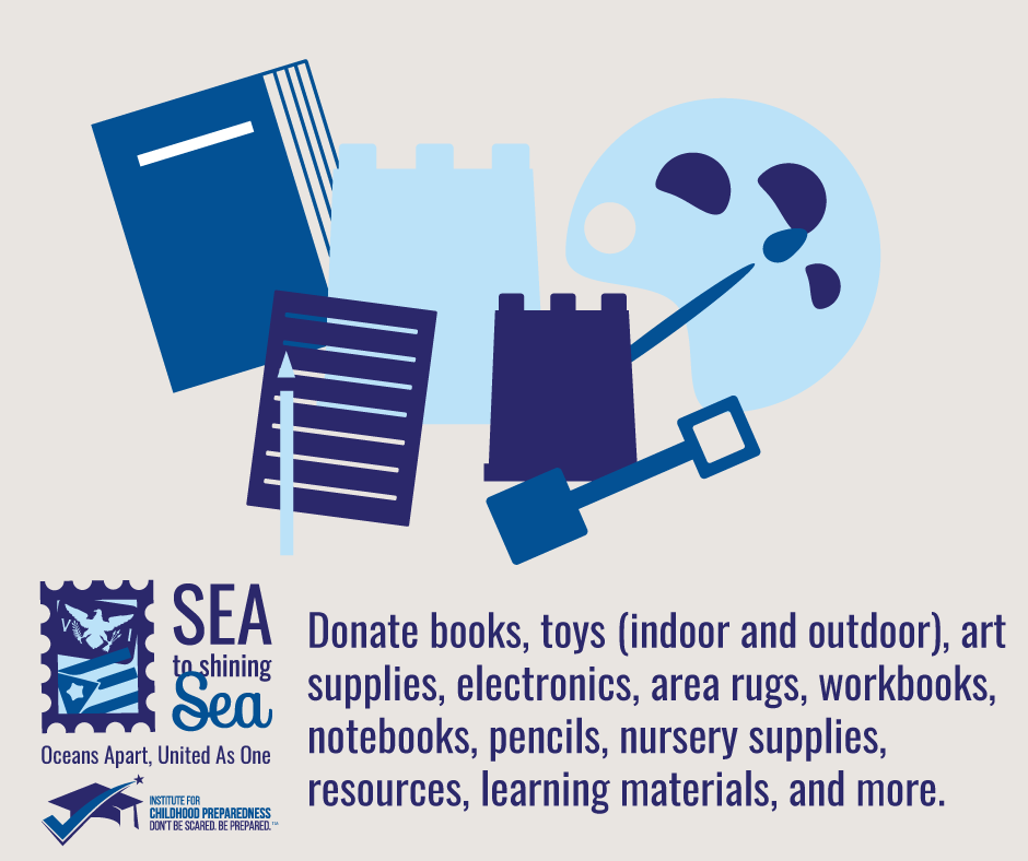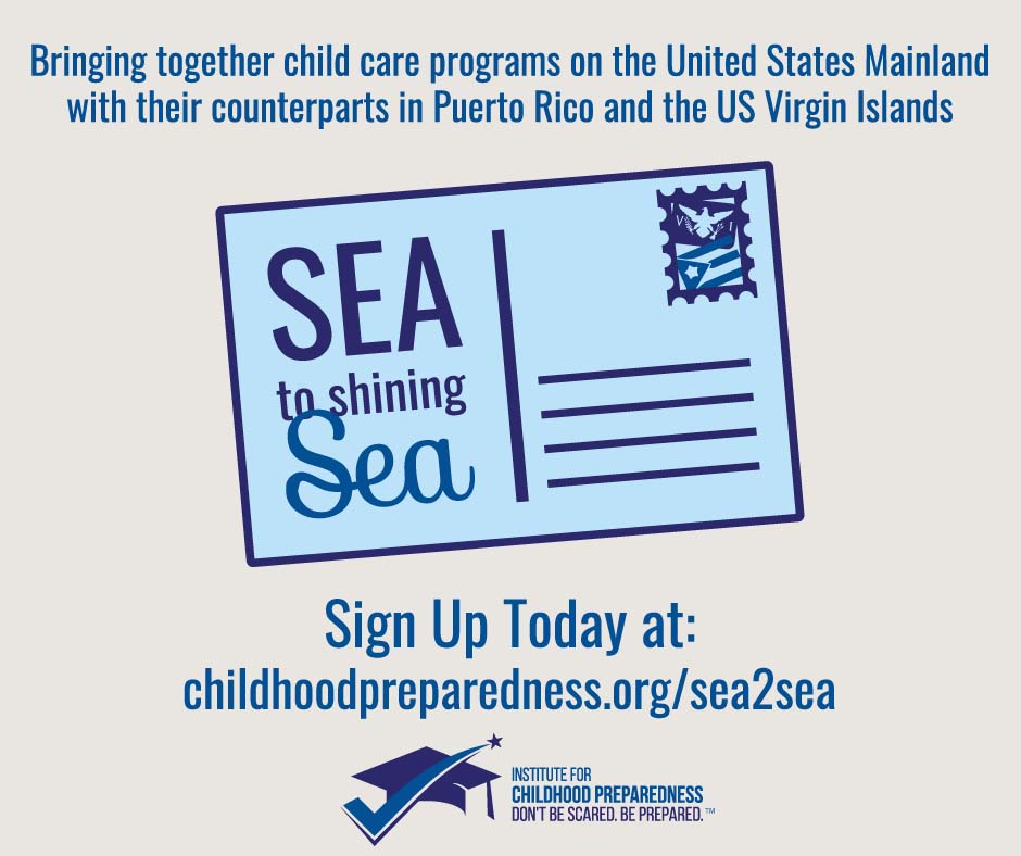 The Sea to Shining Sea program is an exchange program between early childhood programs in the mainland United States and the US Virgin Islands and Puerto Rico that was developed by the Institute for Childhood Preparedness in June 2019. Through support, a pen pal exchange program, and relationship building, the program works to meet the needs of early childcare providers in the USVI and Puerto Rico while providing professional networking experiences and cultural exchange.