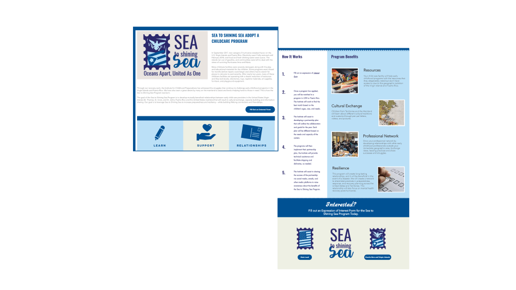 The colors are inspired by the ocean and the beach. While the font, Oswald, works to tie in elements of the Institute for Childhood Preparedness’ main branding. The logos imagery incorporates the flags of USVI and Puerto Rico in a postal stamp as a reference to the pen pal initiative. The zigzagging dividers work to echo the postal stamp elements. While several of the icons, were created using Adobe Illustrator to incorporate additional elements from the branding.