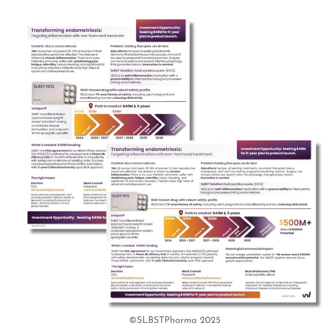 SLBST is a small pharmaceutical company fundraising for a Phase 2 Trial on non-hormonal treatments for endometriosis. I worked with SLBST to develop a pitch deck, powerpoint template and two one-pagers to help better communicate their technology to investors and secure funding. Following the deck revamp, SLBST was selected as one of eight startups in a highly competitive pitch competition.